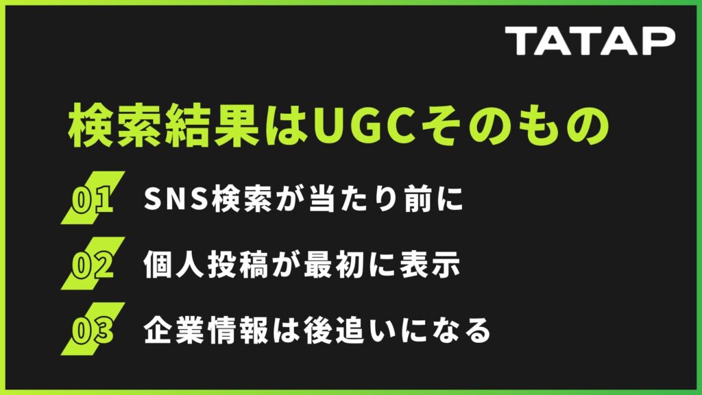 今や検索結果を奪っているのはAIでもGoogleでもなく、SNS上のUGCそのものです。Google検索1位のサイトよりも、TikTokの上位に出てくるUGCの方が圧倒的な影響力を持つ時代、これを「検索のUGC化」と呼びます。