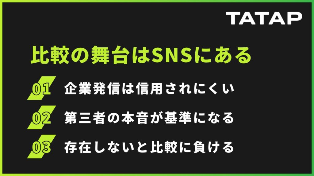 企業は競合と比較されることを嫌がりますが、比較はすでにUGCの中で完結しています。重要なのは「比較されないこと」ではなく、「比較の場(プラットフォーム)に自社ブランドのUGCが適切に存在しているか」なのです。