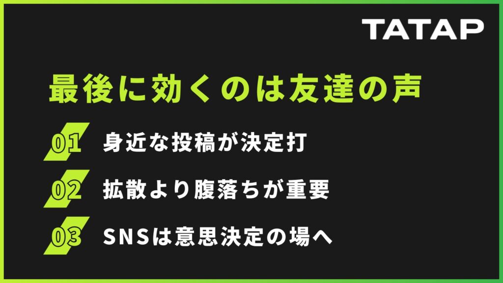 TikTokのバズやリールの再生数も認知には貢献しますが、最終的な腹落ちを作るのは、友達レベルのリアルな口コミです。SNSは「拡散のインフラ」から「口コミのインフラ(意思決定の場所)」へと進化したのです。