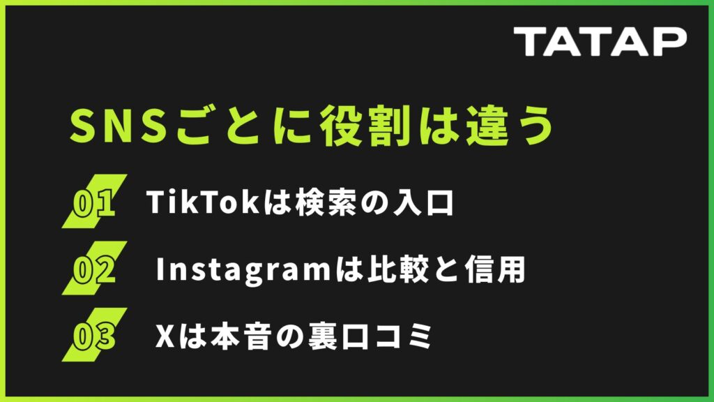 | TikTok | 最前線UGC | 検索の起点。初期興味を作り、トレンドを可視化する。 |