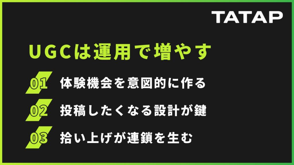 UGCは勝手に生まれるのを待つものではなく、意図的に「運用」していくものです。