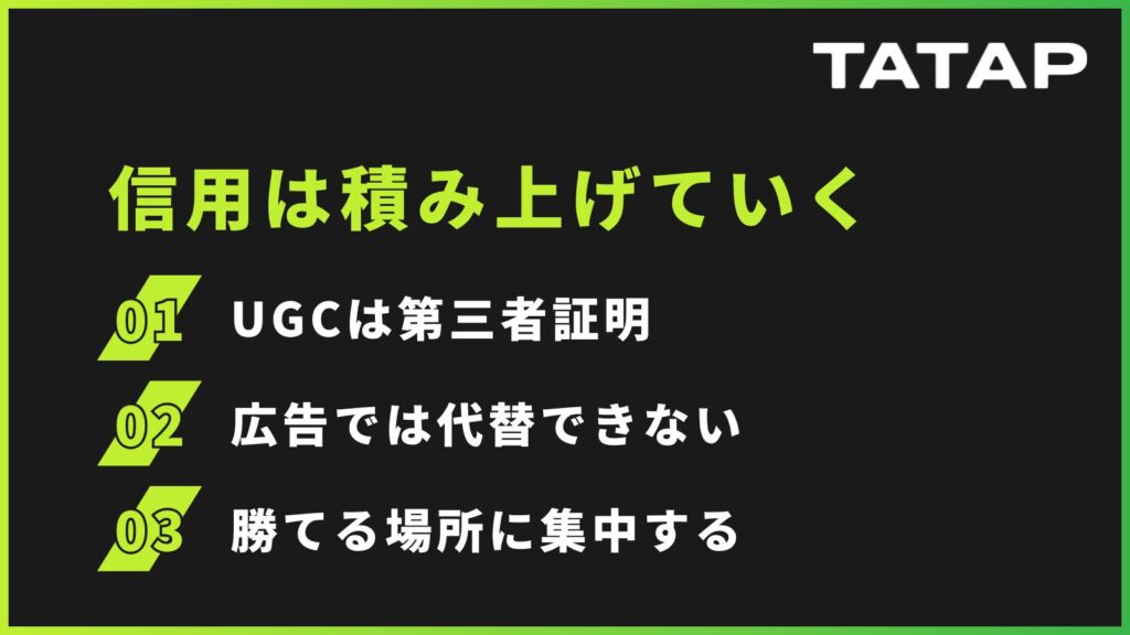 UGCは一時的な「施策」ではありません。それは、ブランドの信用を中長期的に積み上げていくための「資産」です。