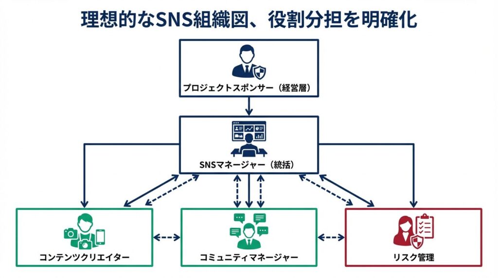 持続可能で利益を生み出すSNS組織を作るためには、「誰が何をするか」という役割(ロール)を明確に定義し、複数名体制(または部門横断型チーム)を構築する必要があります。