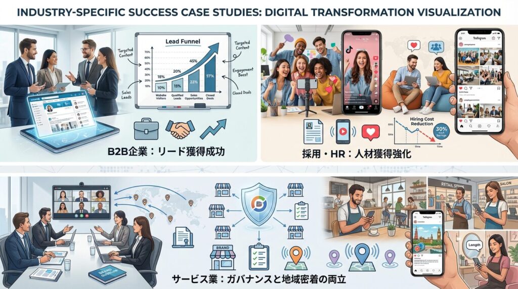 - 組織化の効果: 本部が「トンマナのガイドライン」と「ベースとなる素材」を提供し、各店舗の担当者が地域固有の情報をプラスして発信する「ハイブリッド組織」を構築。本部のコンプライアンス監視ツールを導入することで、リスクを抑えつつ、地域密着型のエンゲージメント(親密度)を最大化。