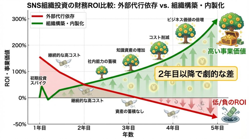 運用代行に月額50万円を永続的に支払い続ける「フロー型」のコスト構造に比べ、初期に教育と組織設計に投資(コンサルティング費用)を行い、その後は社内人件費のみで回す「ストック型」の構造は、2年目、3年目と時間が経つにつれてROIが劇的に高まります。
