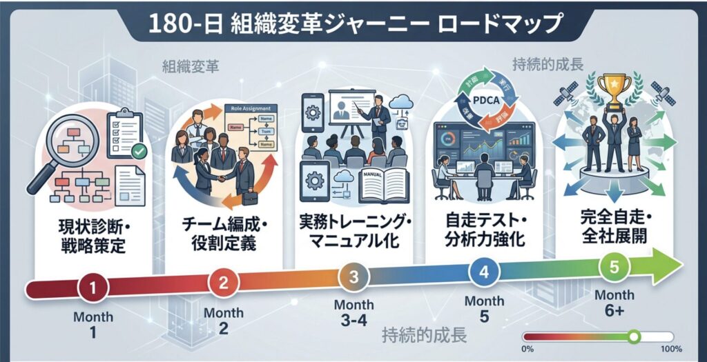 以下は、相談開始から自社で組織が自走するまでの「180日(半年)の完全ロードマップ」です。