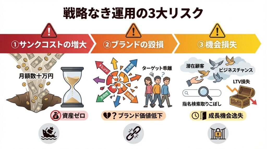 - 機会損失: 本来獲得できたはずの「指名検索」や「LTV(顧客生涯価値)」を取りこぼす。
