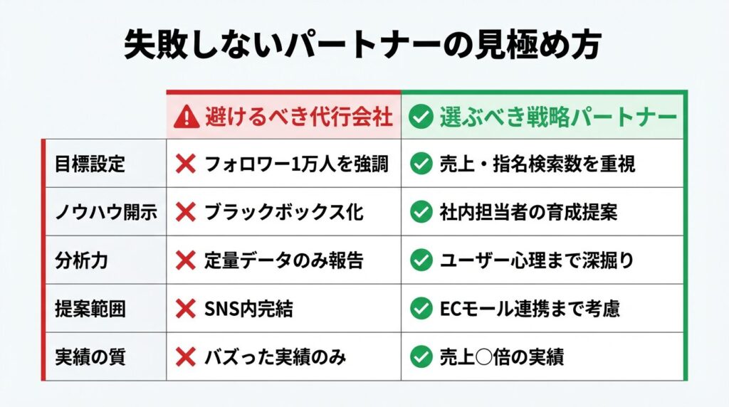 | チェック項目 | 避けるべき代行会社 | 選ぶべき戦略パートナー |