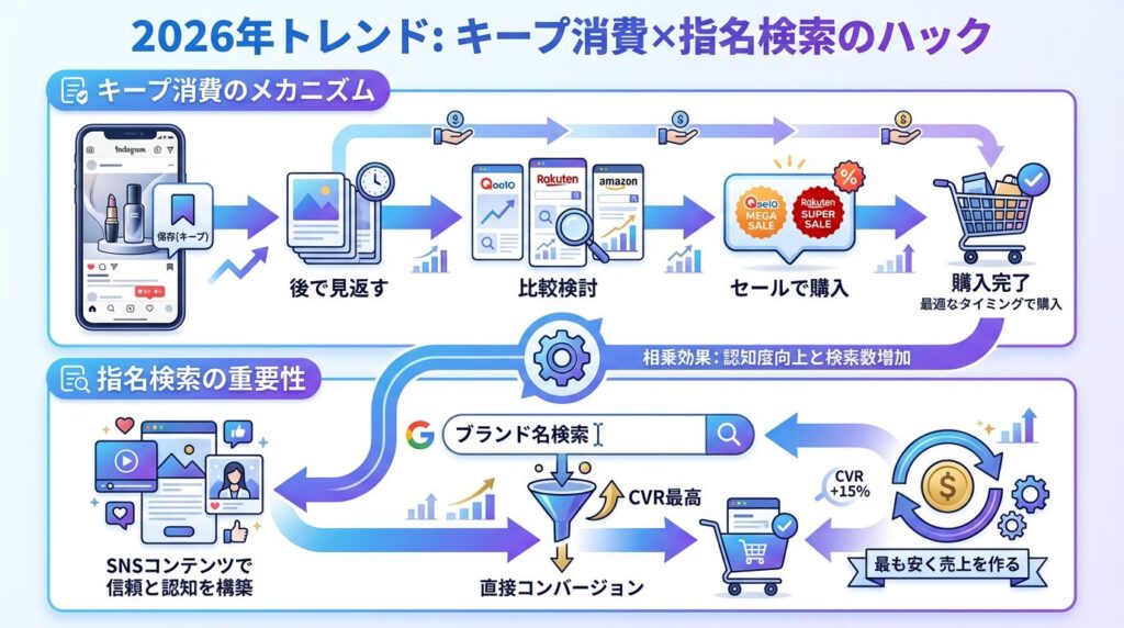 現在の消費者は、SNSで商品を見つけて即座に購入するのではなく、「保存(キープ)」して比較検討し、タイミングの良いセールで購入します。