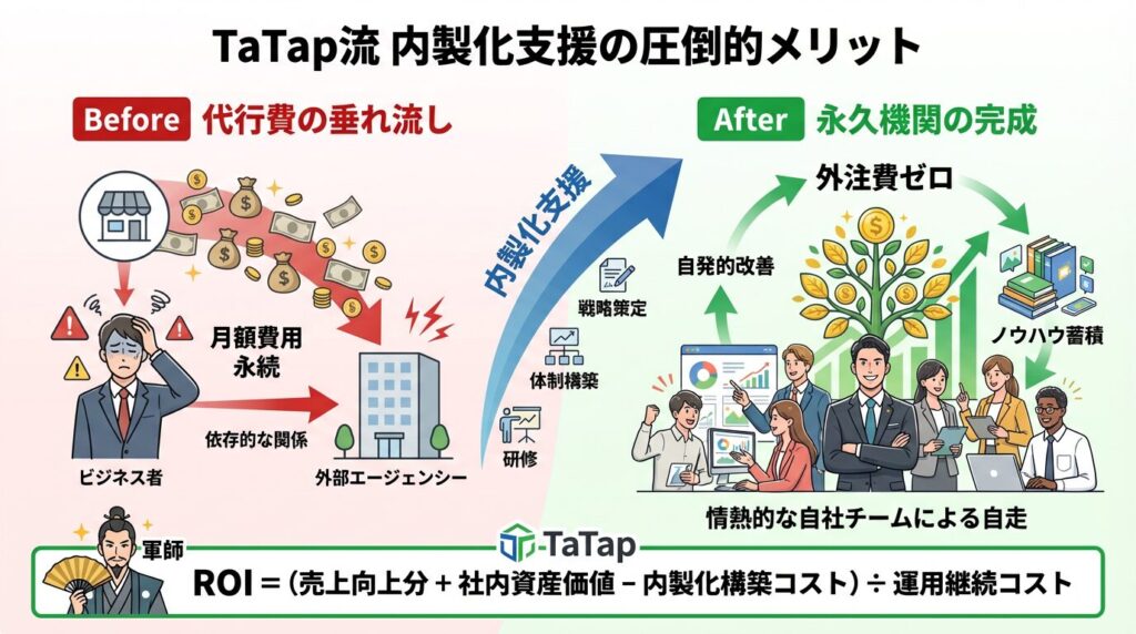 内製化が完了すれば、外部への支払いはなくなり、現場の熱量を持ったスタッフが自発的に改善を続ける「永久機関」が完成します。TaTapはそのための「軍師」として、技術とマインドをインストールします。
