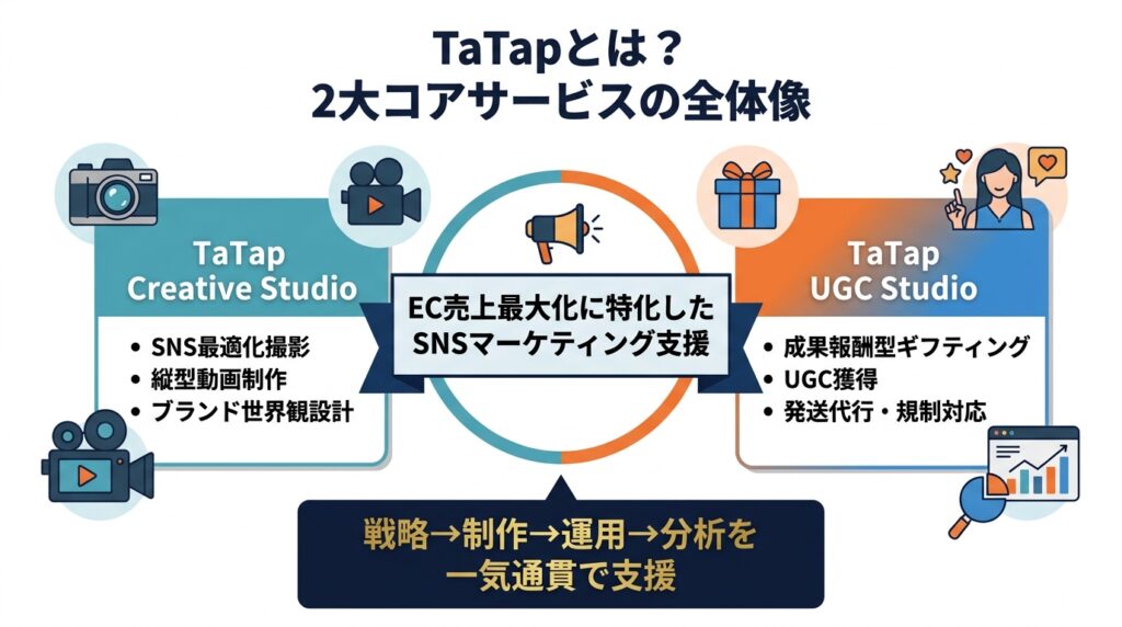 株式会社TaTapは、SNSマーケティング戦略コンサルティングおよびデザイン/動画制作会社です。単なる「投稿代行」ではなく、SNSを通じてEC売上を最大化することにフォーカスした一気通貫の支援体制が特長です。