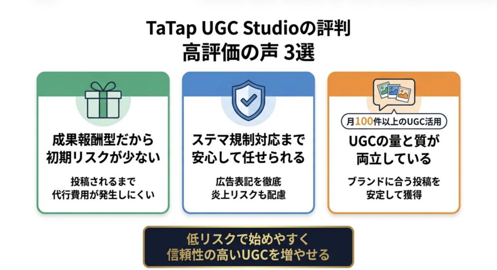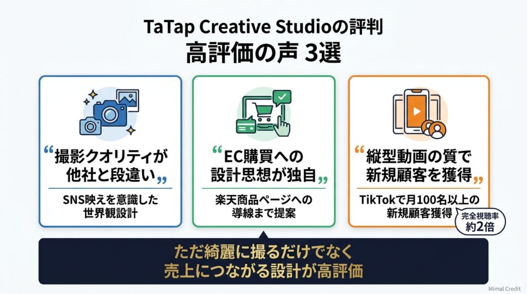 TaTap(タタップ)は、SNS最適化撮影「TaTap Creative Studio」と成果報酬型ギフティング支援「TaTap UGC Studio」を核に、EC事業者のSNS経由売上最大化を専門とする会社です。クライアントからの評判は、クリエイティブの品質・EC特化の専門性・成果報酬型という低リスク体制の3点に集中しており、継続率の高さからも満足度の高さがうかがえます。