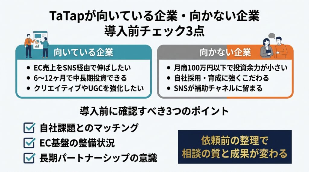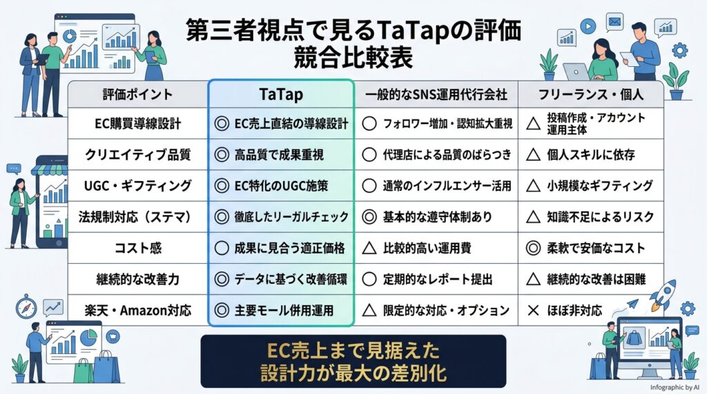 上記の比較からわかるように、TaTapの最大の強みは「EC事業者が本当に必要としているSNSマーケティング」を一気通貫で提供できる点です。SNS上でのフォロワー増加・エンゲージメント率向上だけでなく、それが最終的にEC売上に直結するまでの一連の設計力が、競合との最大の差別化になっています。