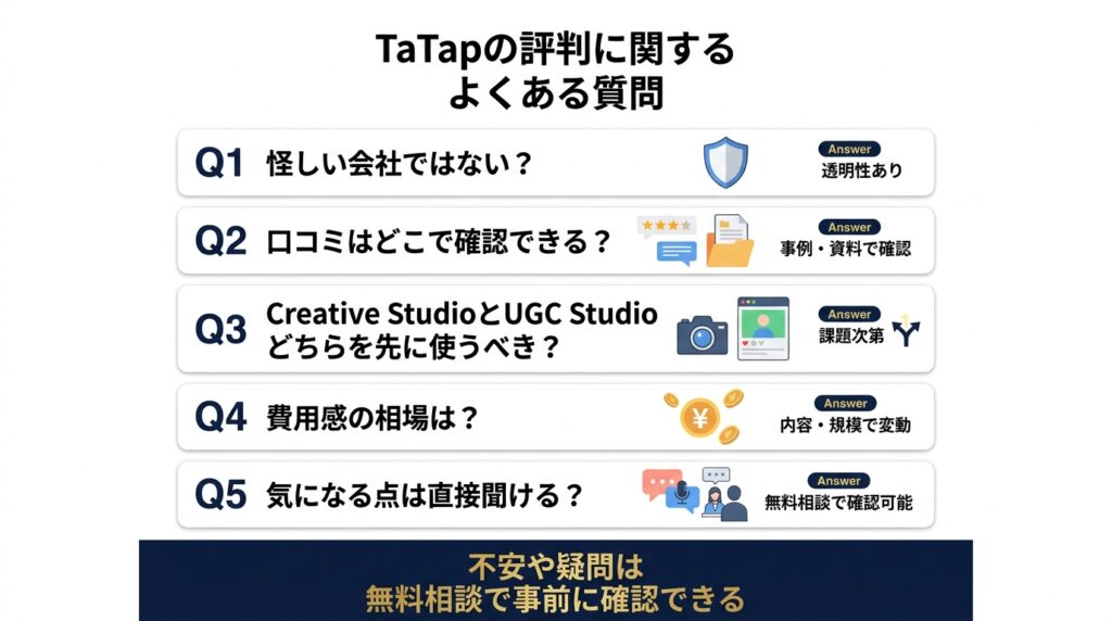 「TaTap 評判」を検索する方の多くは、以下のような疑問を持っていると考えられます。「本当に成果が出るのか」「費用対効果は高いのか」「他社と比べてどうなのか」「怪しい会社じゃないか」——これらについて、この記事でできる限り客観的な情報を提供してきました。