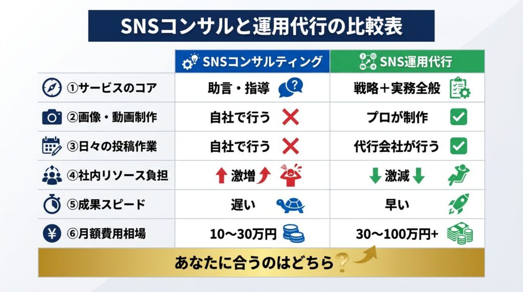 【結論】SNSコンサルと運用代行の決定的な違い(比較表)