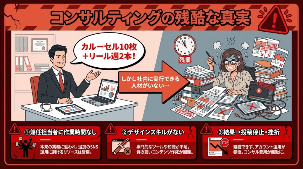「フォロワーを増やすには、毎日投稿して、ユーザーとコミュニケーションを取ってください」といった、ネットで検索すれば誰でも分かるような一般論だけをアドバイスし、月額20万円を請求するコンサルタントです。彼らは「どうやってその時間を捻出するか」「具体的にどんなデザインにすればいいか」という現場の泥臭い課題には一切寄り添ってくれません。