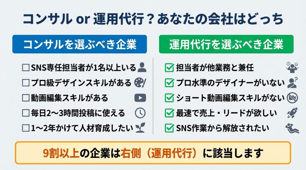 あなたが「プロのノウハウだけ教えてもらって、あとは社内のスタッフで頑張って画像を作って投稿します」というスタンスならコンサルティングを。「社内にノウハウも、投稿を作る時間も、デザインスキルもないから、プロに全部丸投げして確実に売上を立ててほしい」というスタンスなら運用代行を選ぶのが正解です。