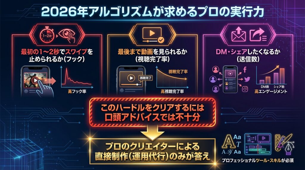 現在のアルゴリズムは、「最初の1〜2秒でユーザーの指を止められたか(フック)」「最後まで動画をスキップせずに見られたか(視聴完了率)」「思わず誰かにDMでシェアしたくなったか(送信数)」をAIが厳密に測定しています。