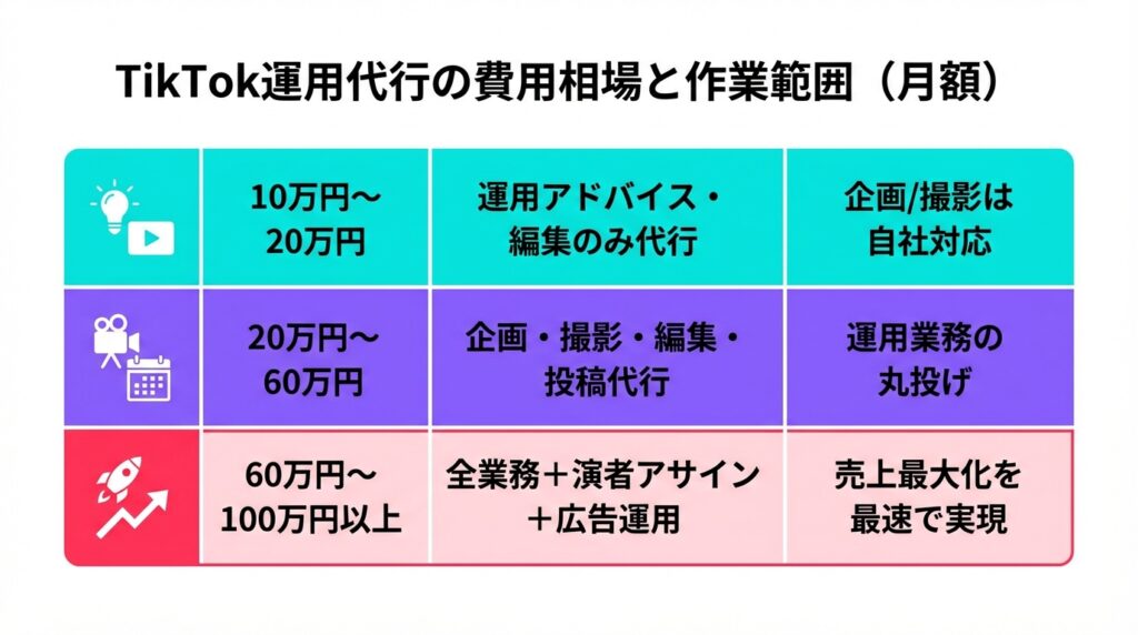 - TikTok運用代行の相場は月10万〜80万超で幅広い
