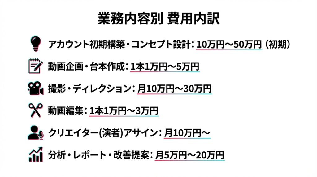 「月額40万円の運用代行費の内訳はどうなっているのか?」と疑問に思う方も多いでしょう。ここでは、TikTok運用代行会社が行う個別のタスクごとに、それぞれの単価相場を紐解いていきます。