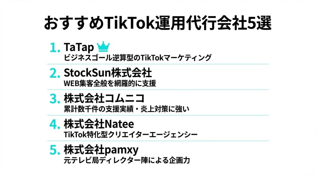 数あるTikTok運用代行会社の中から、2026年の最新アルゴリズムへの対応力と、確かな実績を持つ間違いのないおすすめ企業を5社厳選してご紹介します。