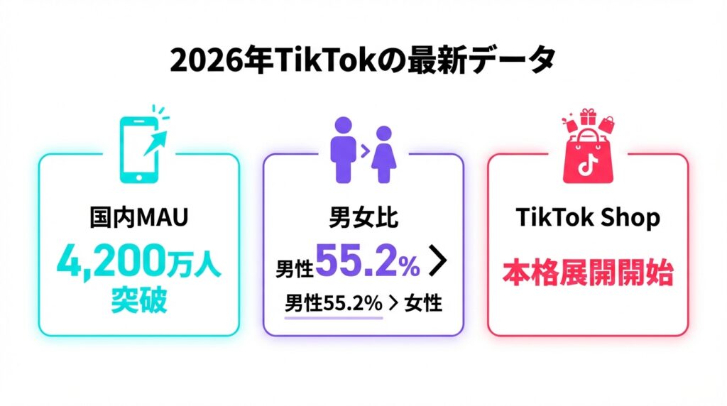ショート動画プラットフォームの覇者である「TikTok」は、2026年現在、日本国内の月間アクティブユーザー数(MAU)が4,200万人を突破し、日本の約3人に1人が利用する巨大なインフラへと成長しました。