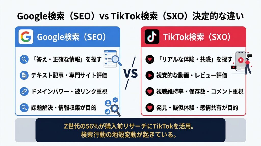 Google検索(SEO)とTikTok検索(SXO)の違い