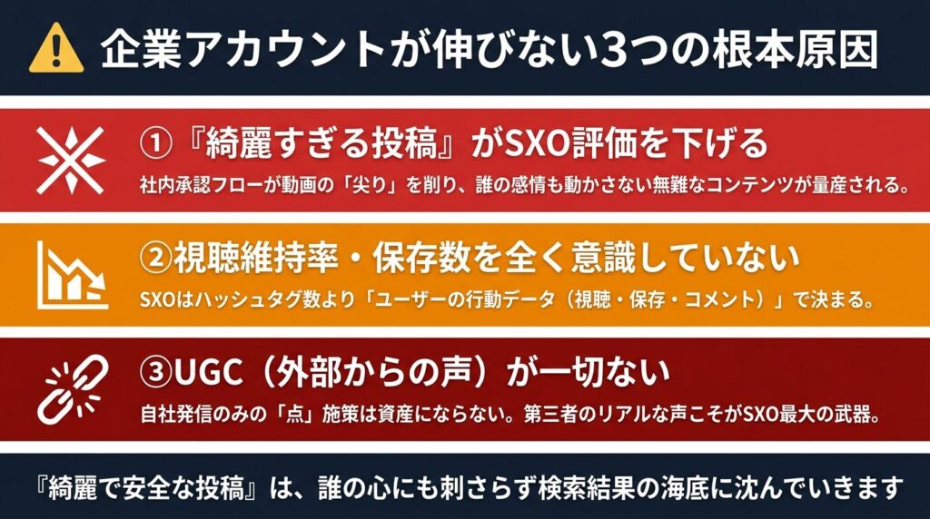 TikTokSXOを成功させるには、動画に「ツッコミどころ」や「驚き」「共感」、時には「違和感」といった余白が必要です。 何重もの社内承認フローを通るうちに、動画の「尖り」が削られ、丸くて面白みのない無難なコンテンツになってしまう。これこそが、企業アカウントがSXOで上位表示を獲得できない根本原因です。全方位から好かれようとする「綺麗で安全な投稿」は、誰の心にも刺さらず、検索結果の海の底に沈んでいきます。