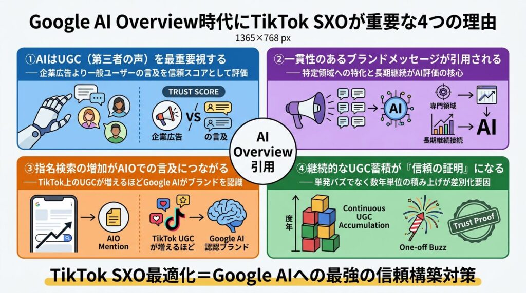 近年、Google検索の上部にAIが回答を生成する「AI Overview(AIO)」が導入されました。このAI時代において、TikTok SXOの重要性はさらに加速しています。