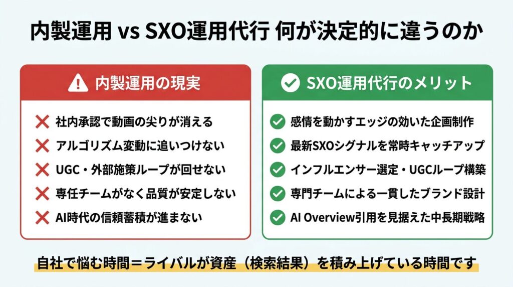 - 「尖り」を作れない社内事情: 前述した「社内承認フローが動画の余白を殺す」問題です。自社メンバーだけで運用すると、どうしても「炎上リスク」や「上層部の目」を気にしすぎてしまい、SXOに不可欠な「感情を動かすエッジの効いたコンテンツ」を作ることができません。