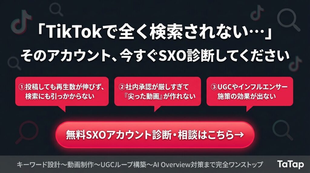 この変化に伴い、TikTokアルゴリズムに最適化し、ユーザーの検索意図を満たす「TikTok SXO(Search Experience Optimization:検索体験最適化)」が、企業のマーケティングにおいて最重要課題となっているのです。