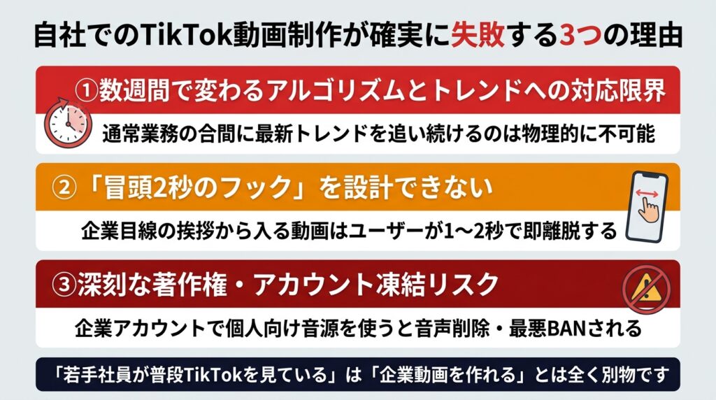 - 自社制作(内製化)が失敗する理由は? 「冒頭2秒のフック」の設計不足、トレンド音源の著作権違反リスク、そして何より「担当者のリソース不足とネタ切れ」により、アカウントが過疎化するためです。
