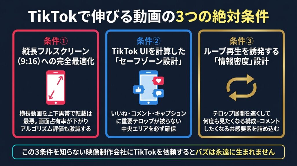 もし貴社が、テレビCMを作っているような「お堅い映像制作会社」にTikTok動画を依頼しようとしているなら、今すぐ考え直してください。 TikTokの世界では、高価なシネマカメラで撮った「映画のように美しい、無言のPR動画」は全く評価されません。求められているのは、「ユーザーの日常に溶け込む親近感(UGCっぽさ)」と「SNSに最適化された技術」です。