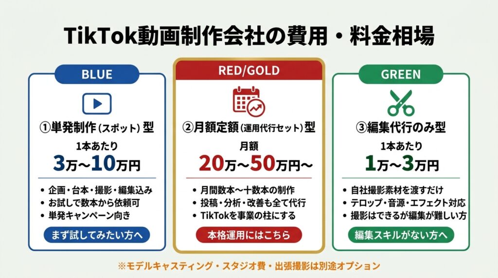 実際にTikTokの動画制作をプロの会社に依頼する場合、料金体系は大きく分けて以下の3パターンになります。自社の予算と、どこまで丸投げしたいかに合わせて検討しましょう。