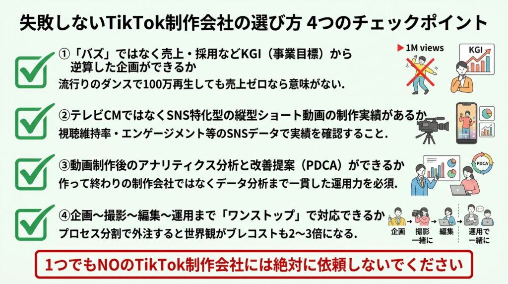 お急ぎの方向けに、TikTok動画制作会社の選び方に関する最も重要なポイントをまとめます。