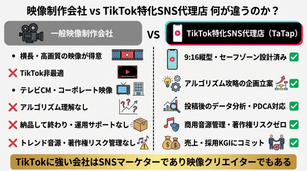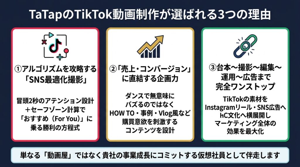 本記事では、SNSマーケティングとクリエイティブ制作のプロフェッショナルであるTaTapが、TikTokの動画制作を専門会社(代理店)に依頼する際の費用相場から、絶対にやってはいけないNG動画の特徴、そしてアルゴリズムをハックして売上に直結させる「SNS最適化撮影」の全貌を徹底解説します。