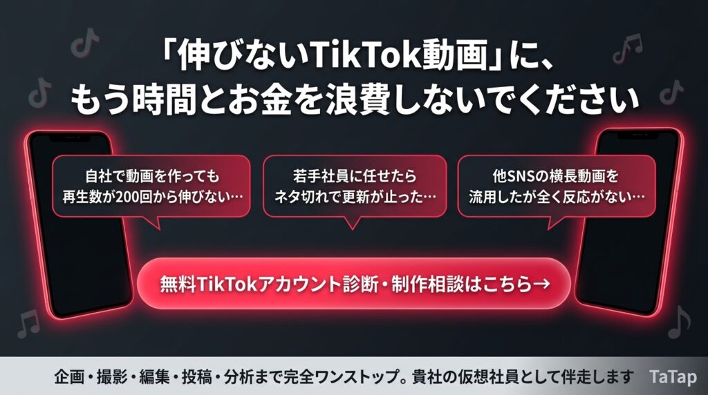 そのような場合は、ぜひ一度TaTapの無料相談・アカウント診断をご活用ください。 貴社の現状の課題をヒアリングし、事業成長に直結する最適なTikTok戦略を、プロの目線から包み隠さずご提案いたします。