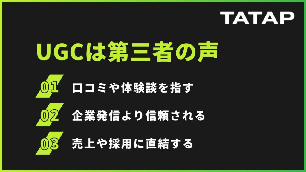 まずUGCについて整理しておきましょう。UGCとは「ユーザー生成コンテンツ(User Generated Content)」の略です。一般の消費者やインフルエンサーが自発的に発信する口コミ、レビュー、体験談などを指します。