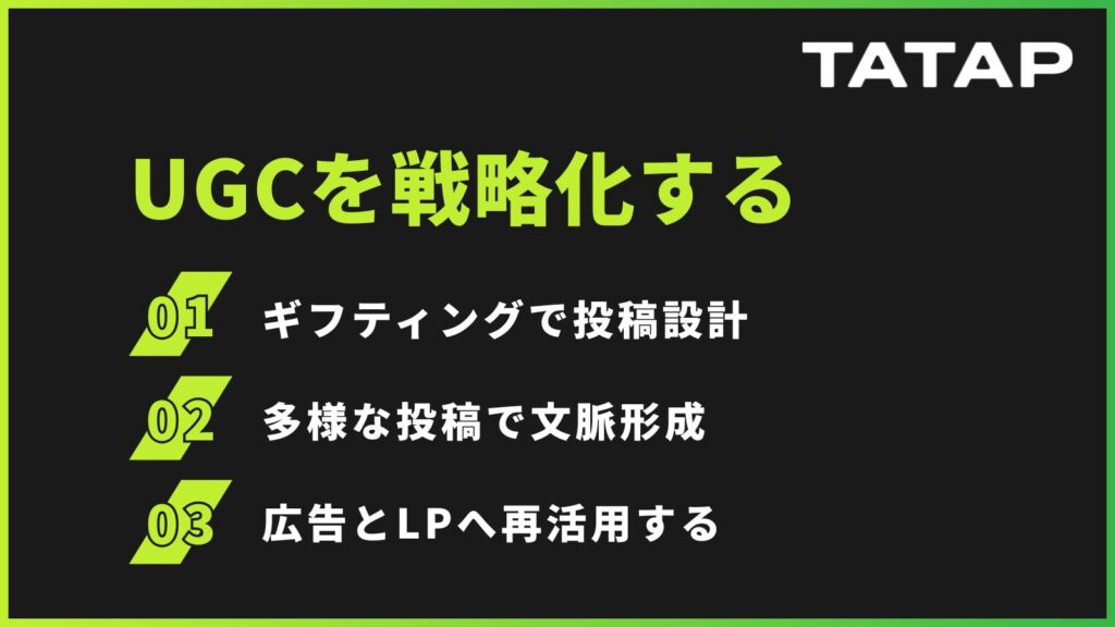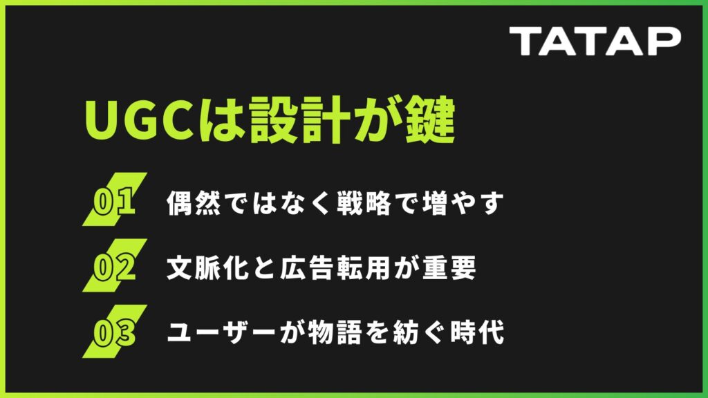 つまり、UGCをどう生み出すか、どう文脈化するか、そしてどう売上に結びつけるか。この設計がマーケティングの核心となっています。