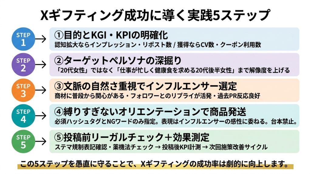 商品を発送する際、商品の特徴やアピールポイントをまとめた資料(オリエンシート)を渡します。しかし、ここで「この文章を一言一句違わず投稿してください」と指示するのは絶対にNGです。*インフルエンサーの個性が消え、露骨な「広告感」が出てしまい、Xのユーザーから最も嫌われるパターンの投稿になります。「絶対に入れてほしいハッシュタグ」や「事実誤認を防ぐためのNGワード」のみを指定し、表現はインフルエンサーの感性に任せることが成功の秘訣です。