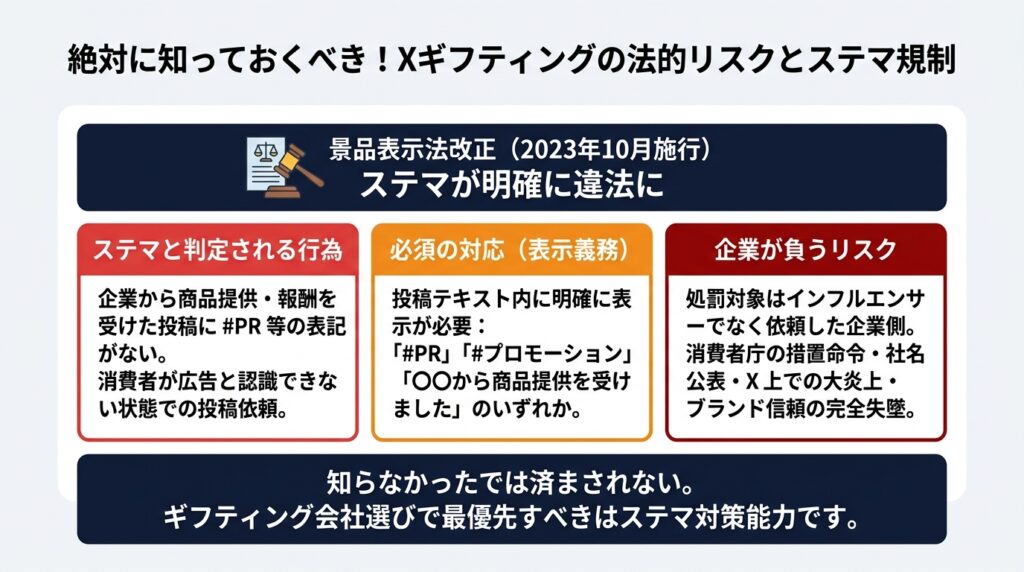 もしインフルエンサーがこの表記を怠り(あるいは意図的に隠し)、ステマと認定された場合、処罰の対象となるのは投稿したインフルエンサーではなく「依頼した企業側(広告主)」です。 消費者庁からの措置命令(社名公表など)が下されるだけでなく、X上での大炎上、ブランドへの信頼の完全な失墜など、企業にとって取り返しのつかないダメージとなります。 だからこそ、ギフティング会社を選ぶ際は「ステマ対策の知見があり、インフルエンサーの投稿管理を徹底できるか」が最重要項目となるのです。