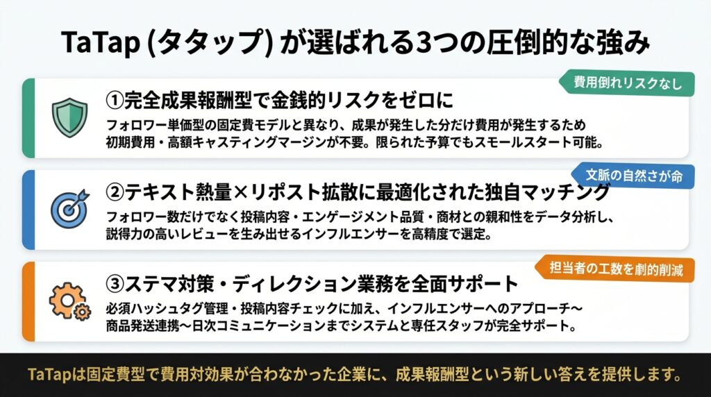 - 完全「成果報酬型」で金銭的リスクを最小化 TaTap最大の特徴は、一般的な「フォロワー単価型(フォロワー数×〇円)」の固定費モデルではなく、成果報酬型の料金体系を採用している点です。多額の初期費用や高額なキャスティングマージンが発生しないため、限られたマーケティング予算でも、リスクを抑えて質の高いギフティング施策をスモールスタートできます。