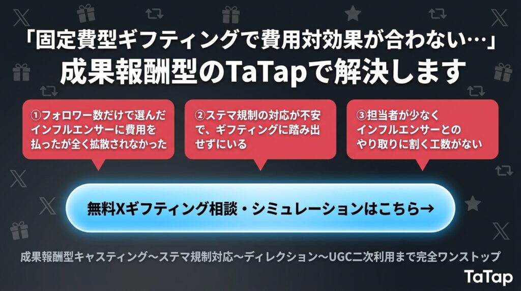 このような課題を抱え、施策への一歩を踏み出せないマーケティング担当者様は非常に多いです。そこでおすすめしたいのが、X(旧Twitter)に特化した成果報酬型のギフティング支援サービス「TaTap(タタップ)」です。