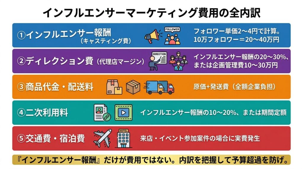 「インフルエンサーに支払う報酬」だけが費用ではありません。予算を組む際は、以下の内訳を考慮する必要があります。
