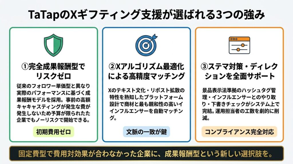 Xのギフティングや・インフルエンサーマーケティングについてはぜひTaTapにお気軽にご相談ください。成果報酬型のギフティング支援も用意しております。