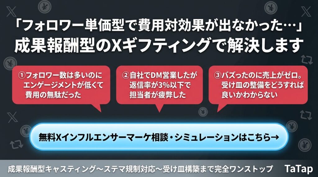 ここまで、Xインフルエンサーマーケティングの相場や手法について解説してきました。一般的な「フォロワー単価型」の依頼は、確実な認知拡大が見込める一方で、「多額の初期費用がかかる」「エンゲージメントが低かった際の金銭的リスクがある」という課題があります。