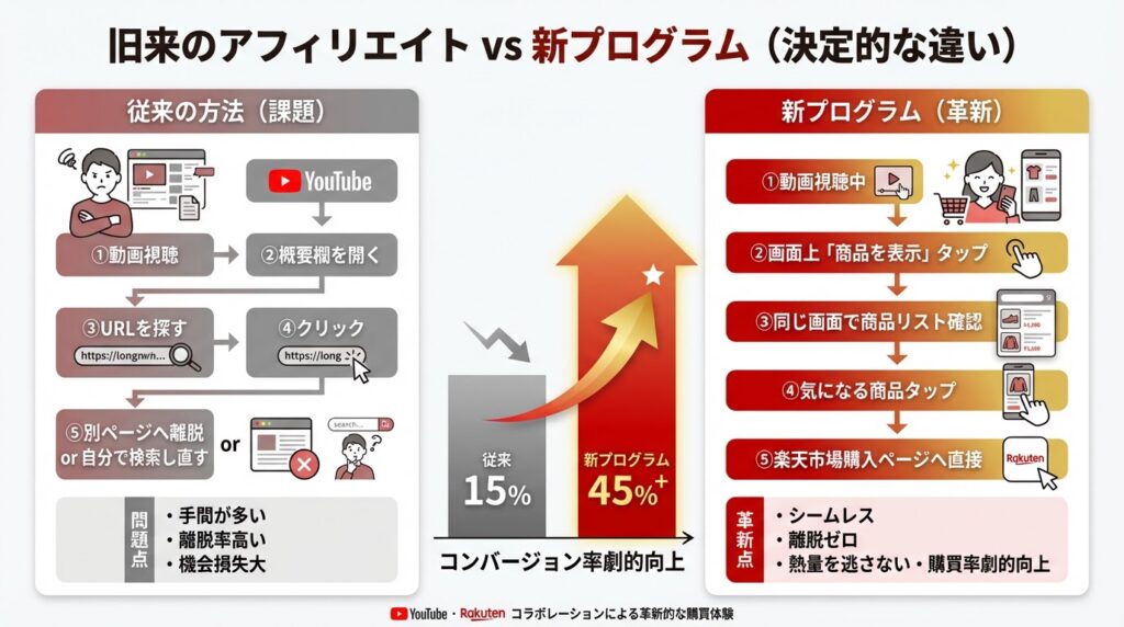- 旧来のアフィリエイトとの決定的な違い: これまでは「概要欄にURLを貼る」手法が主流でしたが、新プログラムでは動画の再生画面上に「商品を表示」ボタンが現れます。ユーザーは動画視聴を妨げられることなく、直感的に商品名や価格を確認し、シームレスに楽天市場の購入ページへ遷移できます。