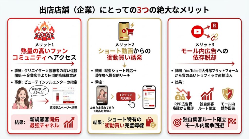 この新しいアフィリエイトプログラムは、クリエイターや視聴者だけでなく、楽天市場に出店している企業(ブランド)にとって計り知れないメリットをもたらします。