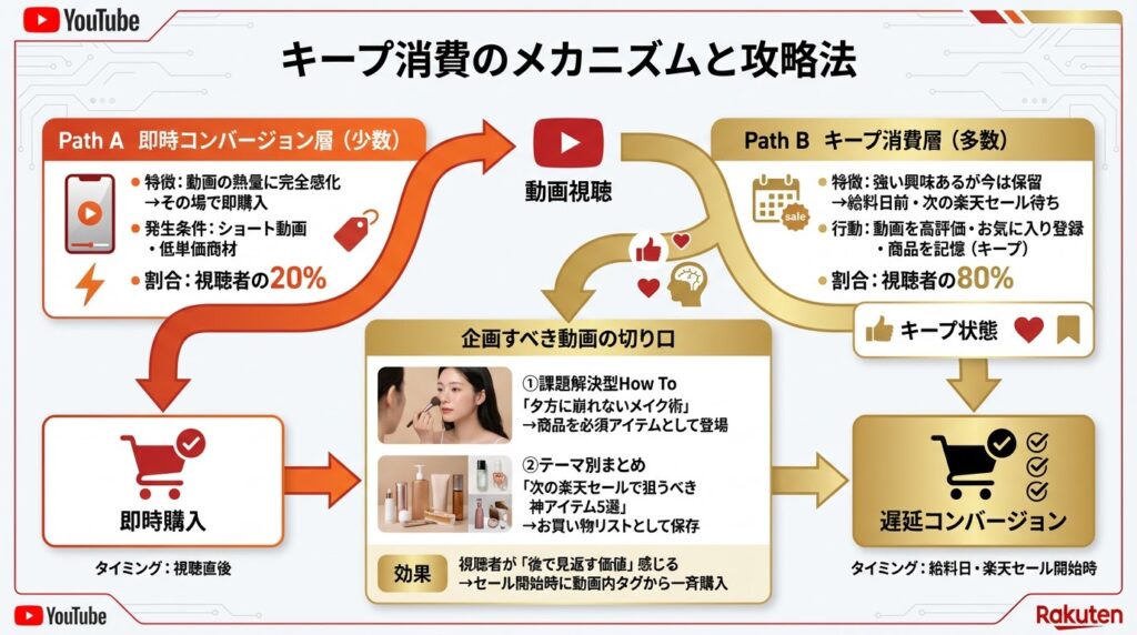 - 成功するYouTube戦略: 単なる商品紹介ではなく、ユーザーの悩みを解決する有益な情報(How Toや比較動画)を提供し、ユーザーの「キープ消費(後で買うために保存・記憶する行動)」を促すコンテンツ設計が必須です。