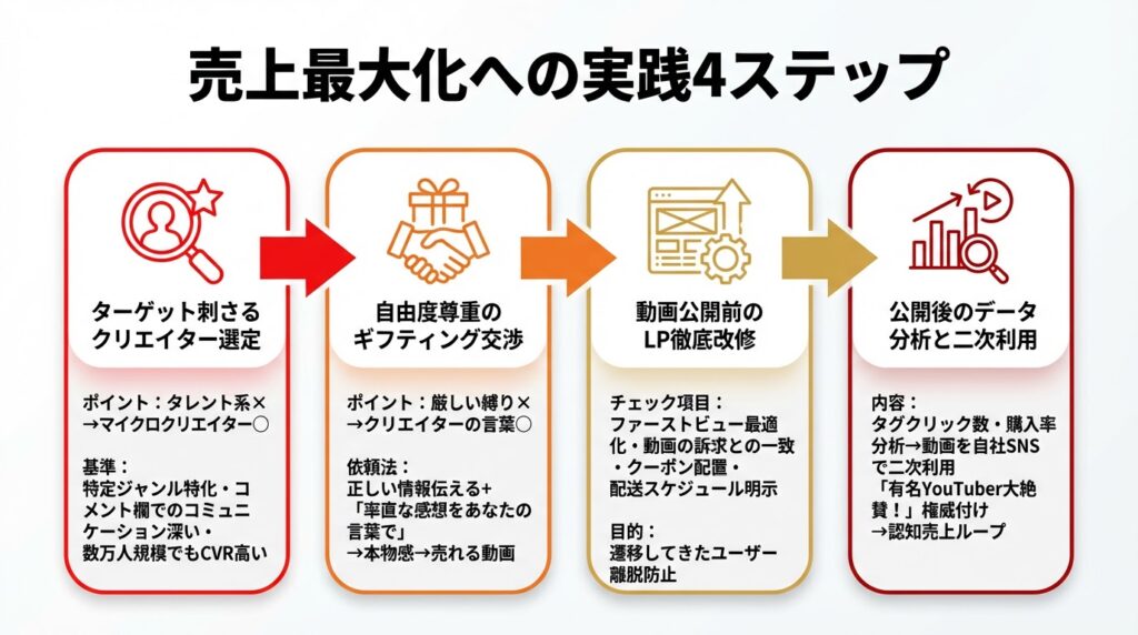 選定したクリエイターに対し、商品の無償提供(ギフティング)や、報酬を支払うタイアップ案件の交渉を行います。 ここで最も重要なのは、「クリエイターの自由度を奪わないこと」です。